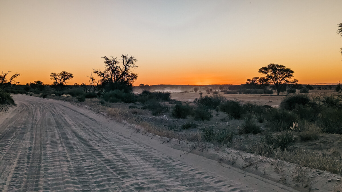Mais ce qui marque sans doute le plus les voyageurs, ce sont les paysages eux-mêmes : l’infini des dunes aux teintes rougeoyantes, contrastant avec le vert des acacias et le bleu profond du ciel. Et quand vient le soir, le Kalahari offre l’un de ses plus beaux spectacles – des couchers de soleil embrasés, inoubliables, qui semblent mettre le sable en feu.