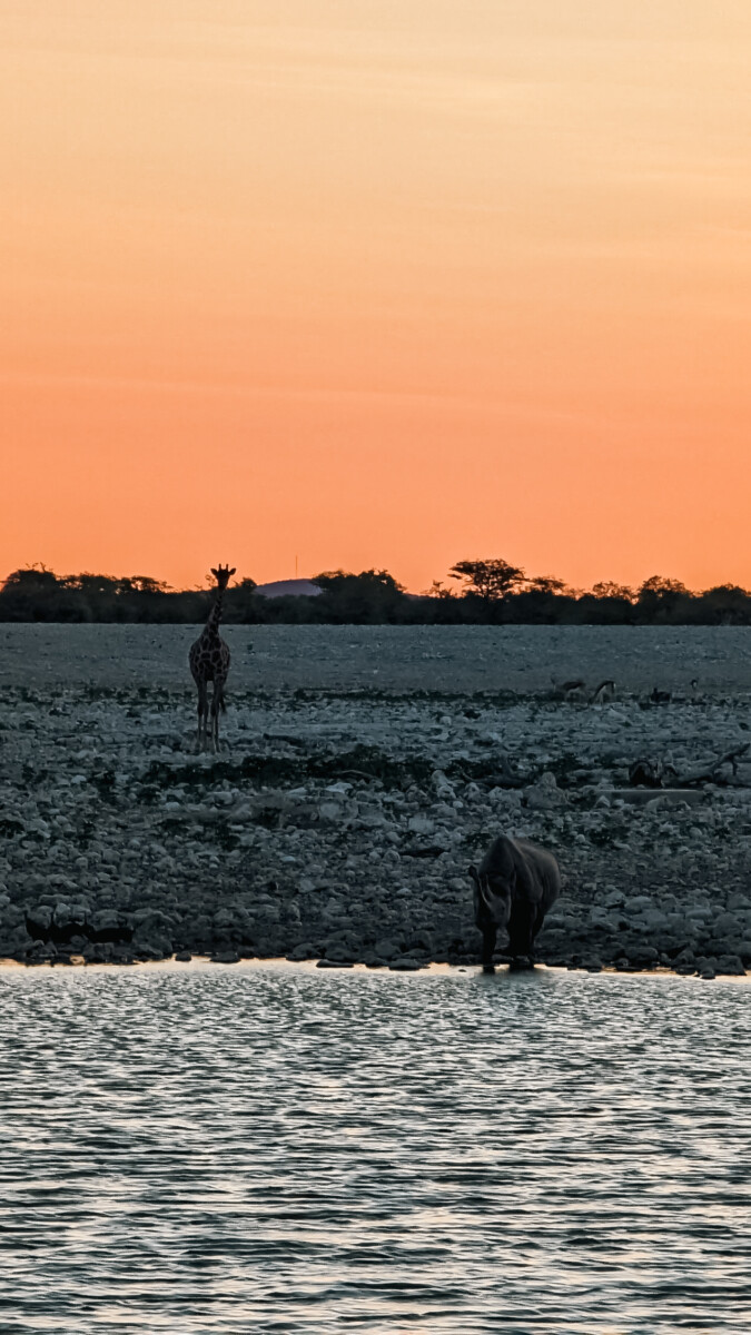 - Okaukuejo : célèbre pour son point d’eau éclairé la nuit, c’est l’un des endroits les plus spectaculaires pour observer les rhinocéros noirs, souvent rejoints par les éléphants, girafes et springboks. Le coucher du soleil embrasant la plaine y reste un souvenir inoubliable.