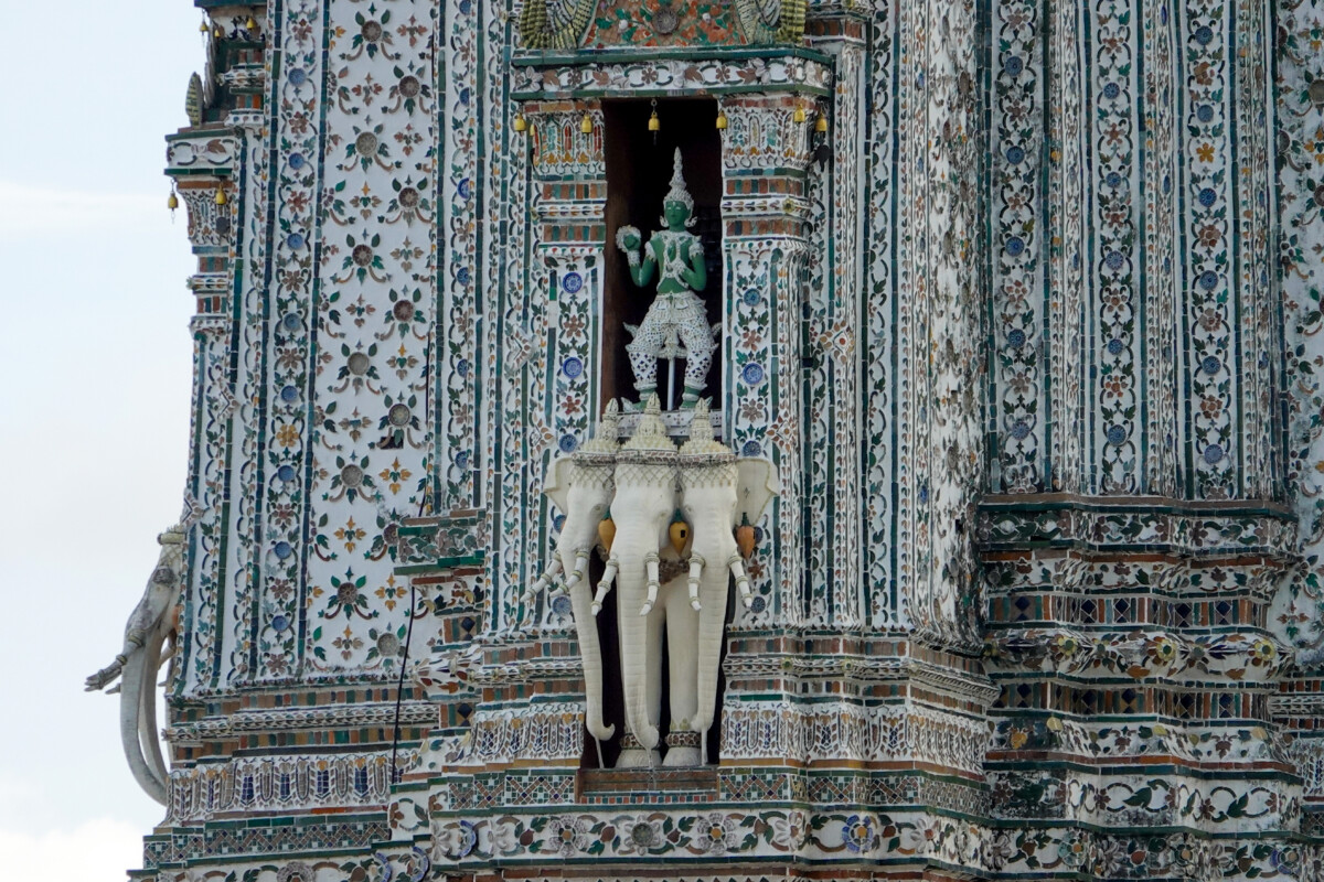 Le Wat Arun a été fondé au XVIIe siècle sous le règne du roi Taksin, mais c’est sous le règne du roi Rama II au début du XIXe siècle que sa structure actuelle a été achevée. Il est notamment connu pour son prang central, une tour élancée de 79 mètres de hauteur, qui représente le mont Meru, le centre de l’univers dans la cosmologie hindoue et bouddhiste. Le prang est décoré de magnifiques mosaïques faites de morceaux de porcelaine et de verre, créant un contraste éclatant lorsqu’il est frappé par le soleil.