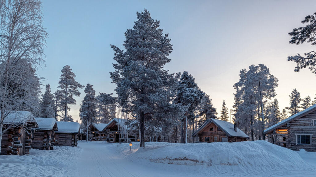 Situé au nord de la Laponie finlandaise, à environ 45 minutes à 1 heure de route d’Ivalo, le village de Nellim marque une vraie rupture avec le monde du quotidien. Le trajet pour y parvenir donne déjà le ton : forêts profondes, routes bordées de neige, lacs gelés et paysages de plus en plus ouverts à mesure que l’on s’approche du lac Inari.